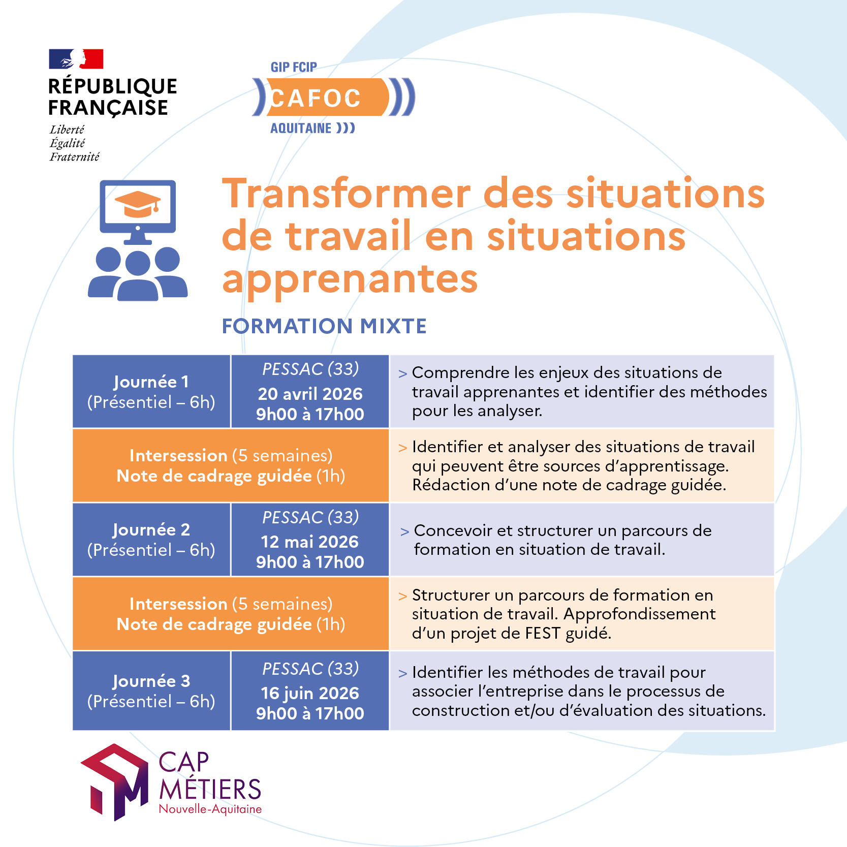 Modules de formation Prochaines actions dispensées par le CAFOC en partenariat avec Cap Métiers Nouvelle-Aquitaine En 2026, le CAFOC poursuit son partenariat avec Cap Métiers Nouvelle-Aquitaine dans le cadre du programme de professionnalisation. Transformer des situations de travail en situations apprenantes D'avril à juin 2026 - FORMATION MIXTE Plus d'informations sur Cap Métiers